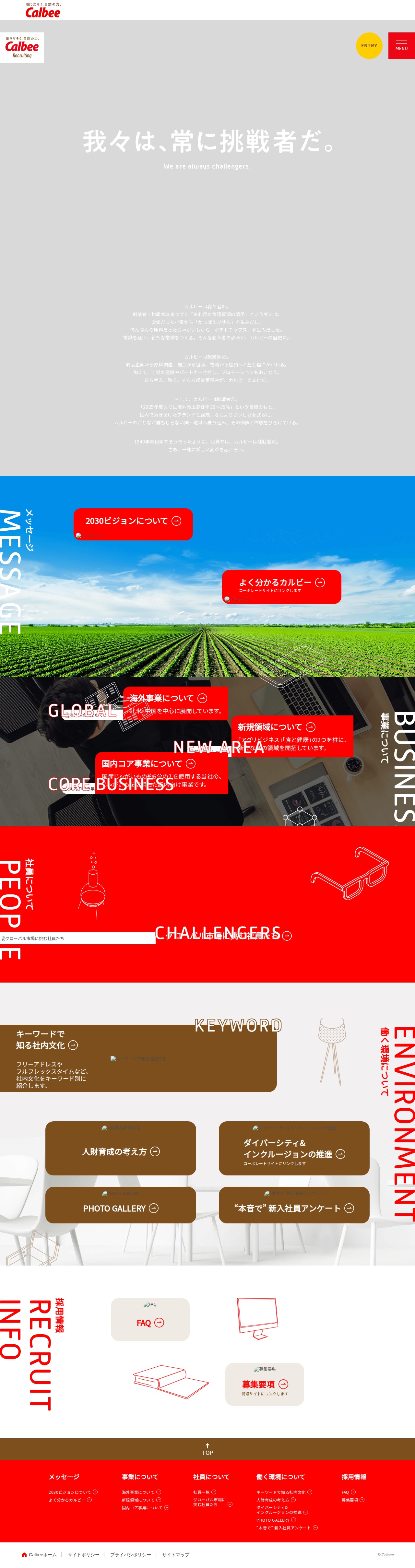 This page is Calbee's recruitment site. Calbee is a challenger company that has created innovation since its founding, turning underutilized food resources into popular products like Karaage Ebi and potato chips. The company is characterized by entrepreneurial spirit, managing all processes from product planning to retail, and ambitious global expansion targeting 30-35% overseas sales by 2025. Calbee operates in North America and China, develops new business areas in agribusiness and food health, and manages domestic operations using domestic potatoes. The company promotes flexible work environments with free address systems and flextime, emphasizing diversity and inclusion.