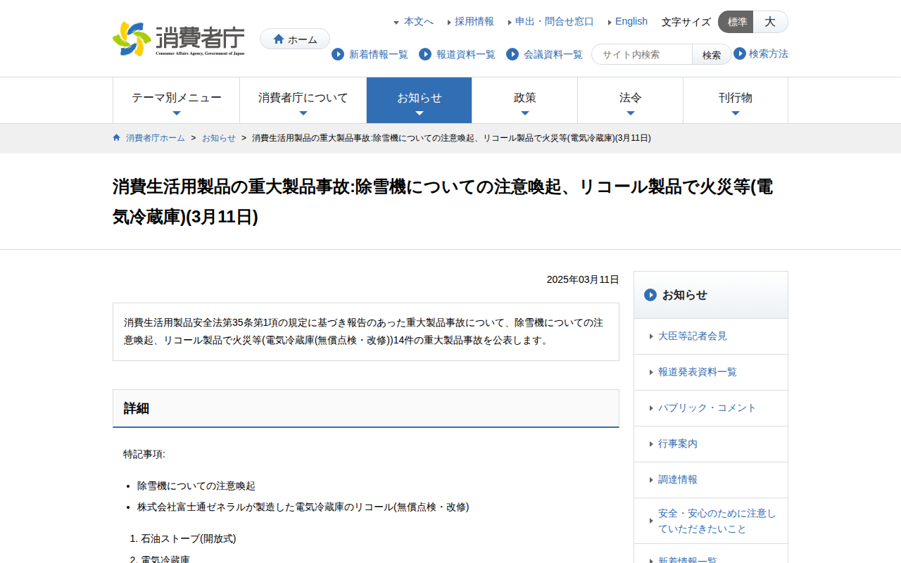 消費生活用製品の重大製品事故:除雪機についての注意喚起、リコール製品で火災等(電気冷蔵庫)(3月11日) | 消費者庁 - Saved screenshot
