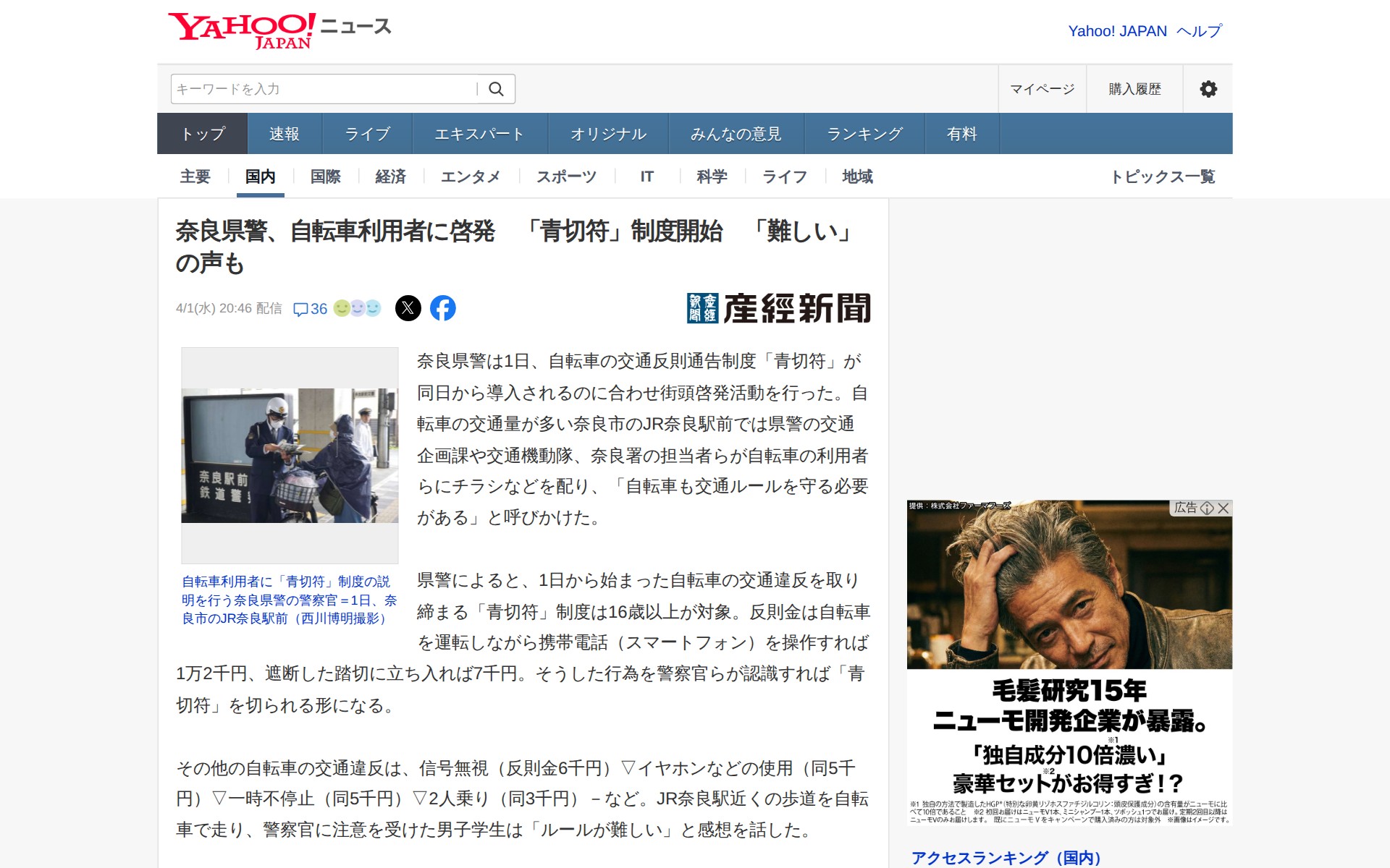 奈良県警、自転車利用者に啓発 「青切符」制度開始 「難しい」の声も(産経新聞) - Yahoo!ニュース - Saved screenshot
