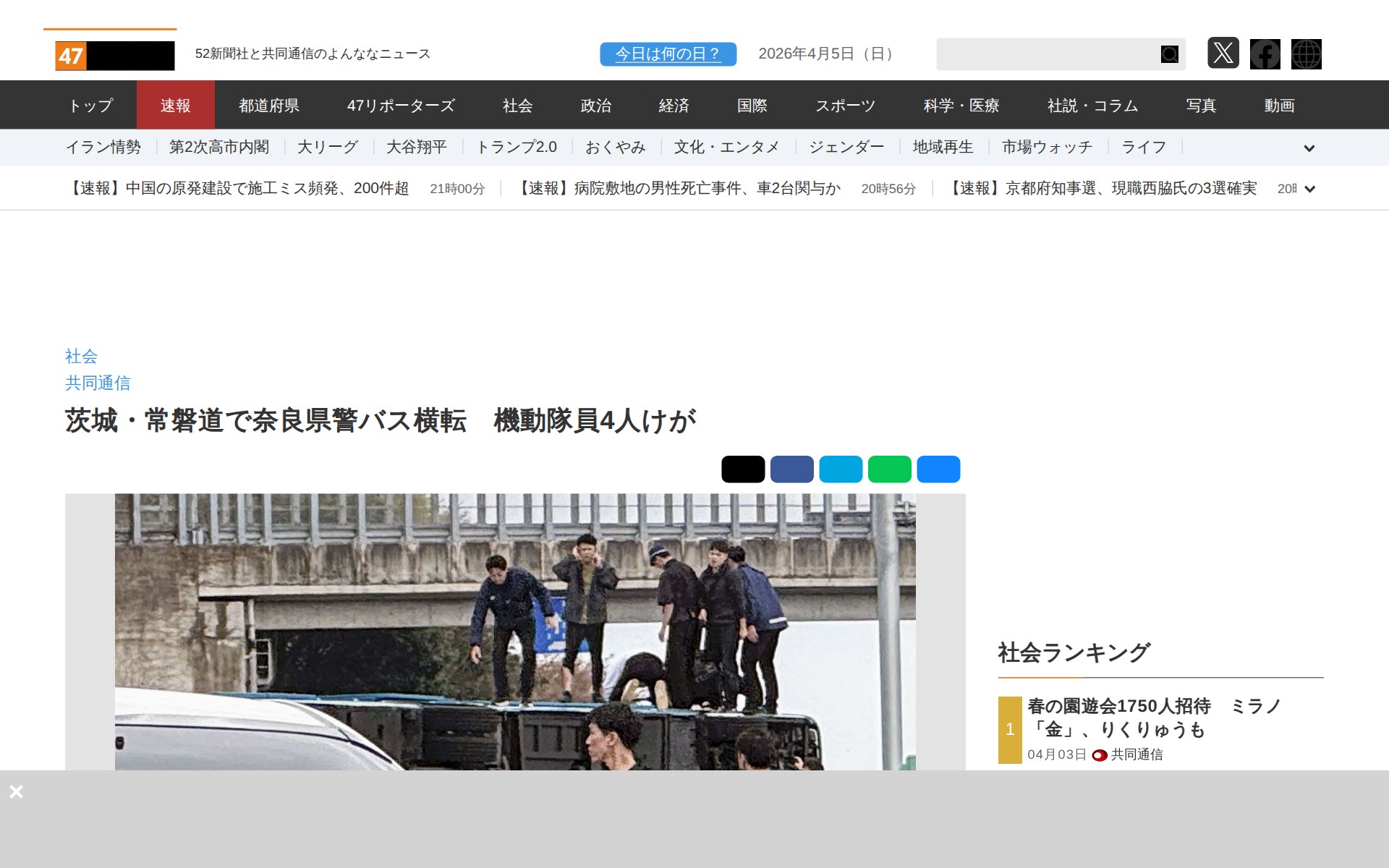 茨城・常磐道で奈良県警バス横転 機動隊員4人けが|47NEWS(よんななニュース) - Saved screenshot