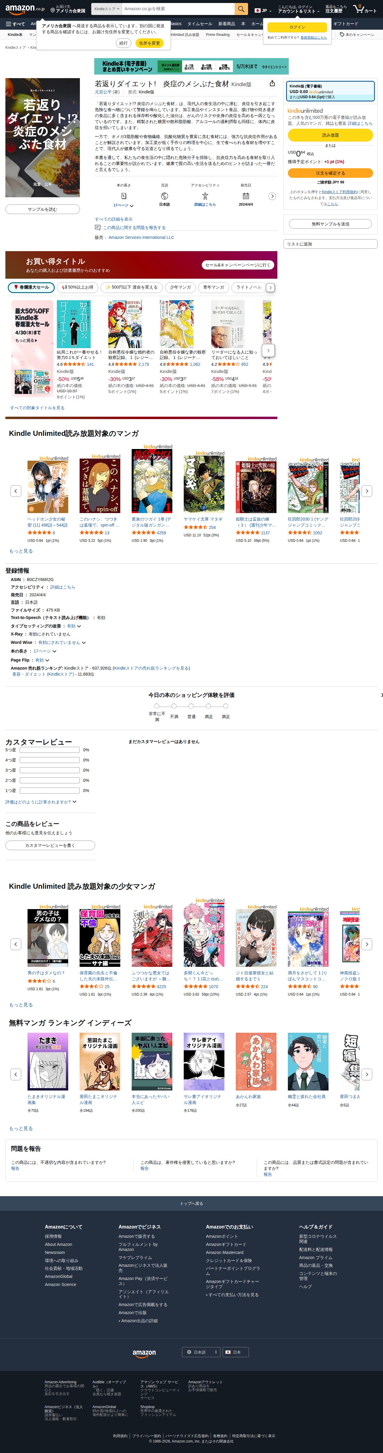 This page presents a Kindle e-book titled "Rejuvenation Diet! Inflammatory Foods" by Motomiya Kohei. The book warns about dangerous foods in modern diets that cause inflammation. Processed foods, instant meals, fried items, and preserved foods high in oxidized oils, refined sugars, and saturated fats increase cancer risk and systemic inflammation. Conversely, foods rich in omega-3 fatty acids, dietary fiber, and antioxidants possess powerful anti-inflammatory properties. The book advocates for homemade cooking and raw foods to protect health. Published April 4, 2024, 17 pages, priced at 99 yen.