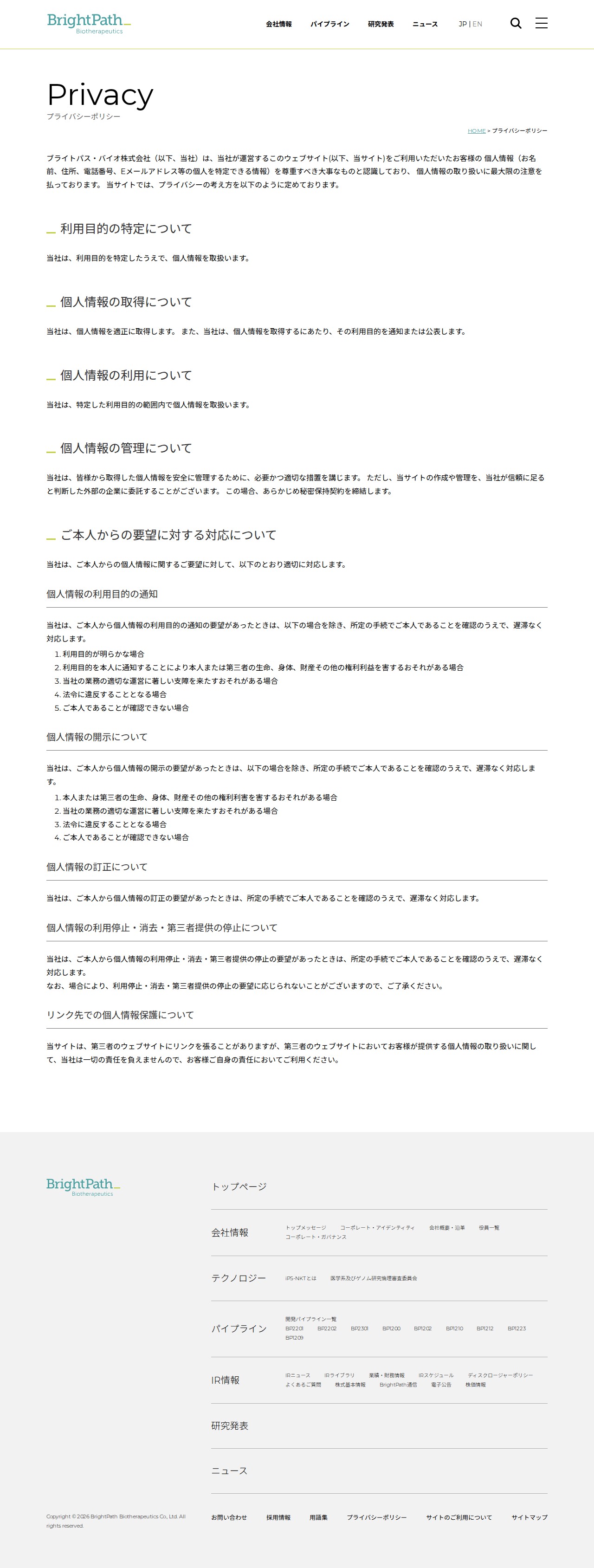 プライバシーポリシー|ブライトパス・バイオ株式会社