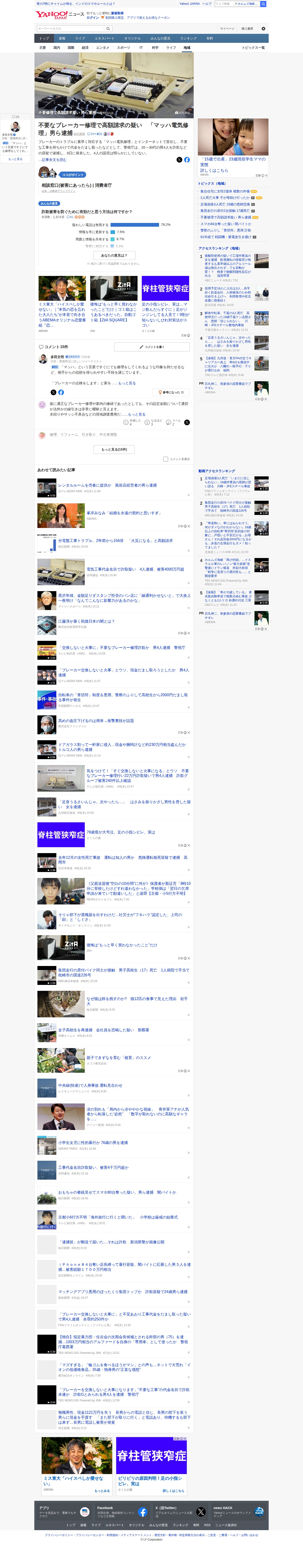 This page reports on a breaker repair scam case. Four men in their 20s-30s operating under the name "Mach Electric Repair" were arrested by the Tokyo Metropolitan Police on fraud charges. They advertised quick response services online, proposing unnecessary breaker repairs and extorting money from victims. Using false claims like "replacement is necessary to prevent fires," they defrauded customers of over 40 million yen across more than 240 cases. The incident highlights transparency issues in repair and renovation industries.
