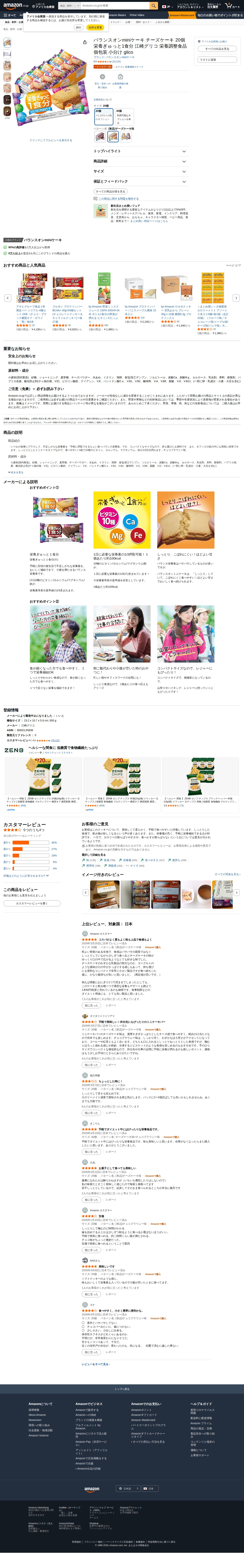 This page features the Glico "Balance On mini Cheese Cake 20 pieces," a nutritional supplement snack. It comes individually wrapped for convenience, with one serving containing essential nutrients. The product is the #1 bestseller in the nutritional supplement snack category on Amazon, with over 15,000 reviews averaging 4.0 stars. Priced from ¥1,120, it offers excellent value. The Balance On mini Cake brand maintains a 90% positive rating from over 10,000 customers, with more than 50,000 purchases in the past three months.