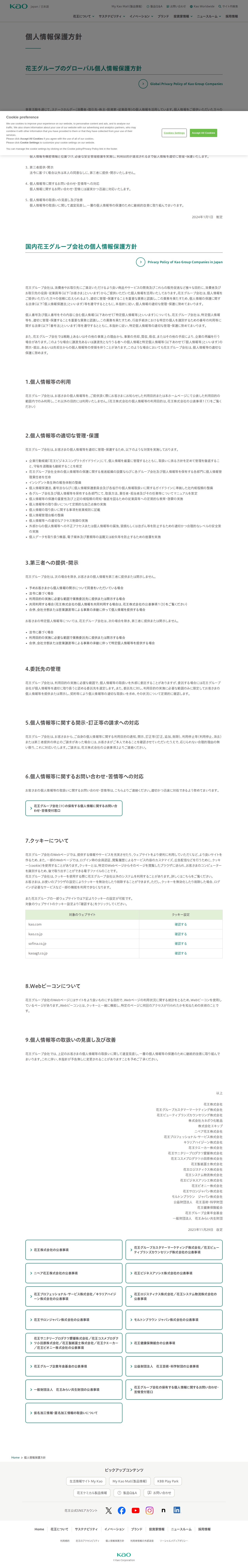 This page presents Kao Group's Personal Information Protection Policy. The global policy recognizes protecting stakeholder information as a critical responsibility while complying with laws. The domestic policy outlines principles including lawful acquisition and use of personal information, appropriate management and security measures, restrictions on third-party disclosure, prompt complaint response, and continuous improvement. It also addresses handling of specific personal numbers and information during corporate restructuring. The policy was established on January 1, 2024.
