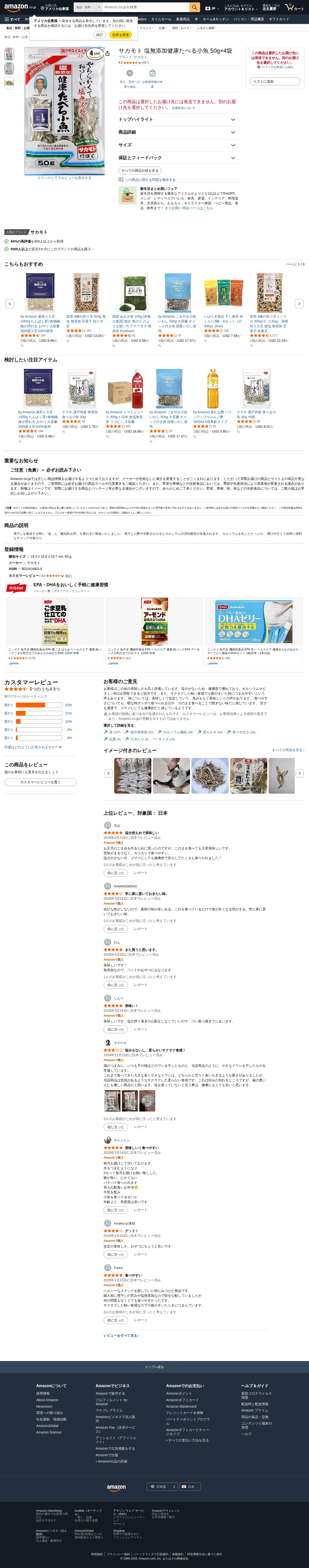 Amazon.co.jp: サカモト 塩無添加健康たべる小魚 50g×4袋 : 食品・飲料・お酒 - Saved screenshot
