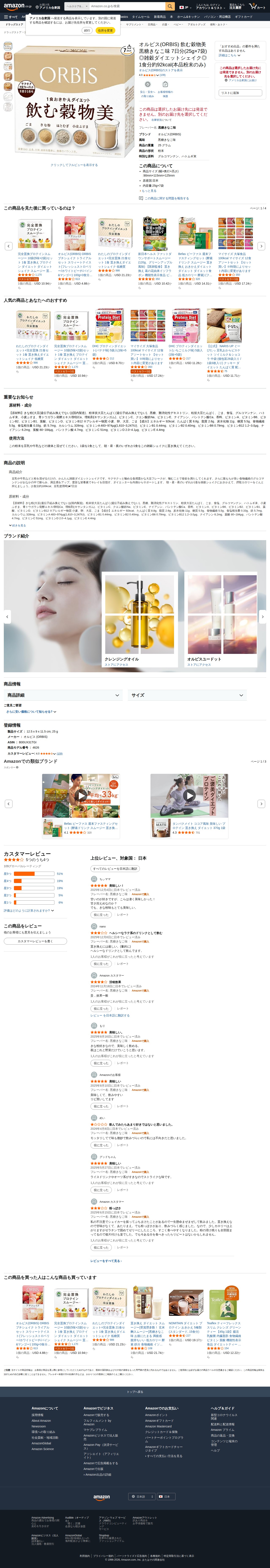 Amazon | オルビス(ORBIS) 飲む穀物美 黒糖きなこ味 7日分(25g×7袋) ◎雑穀ダイエットシェイク◎ 1食分約92kcal(本品粉末のみ) | オルビス(ORBIS) | ダイエットシェイク - Saved screenshot