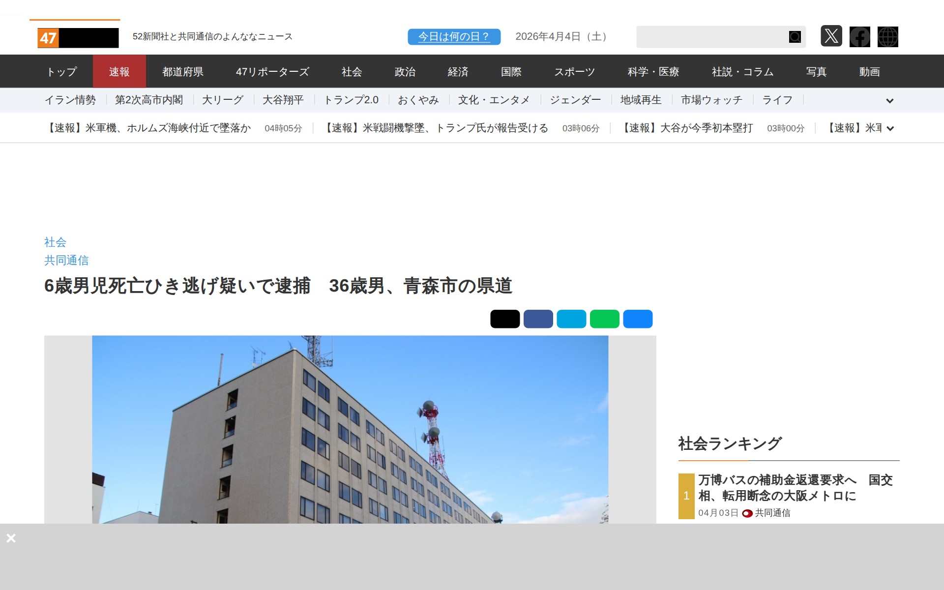 6歳男児死亡ひき逃げ疑いで逮捕 36歳男、青森市の県道|47NEWS(よんななニュース)