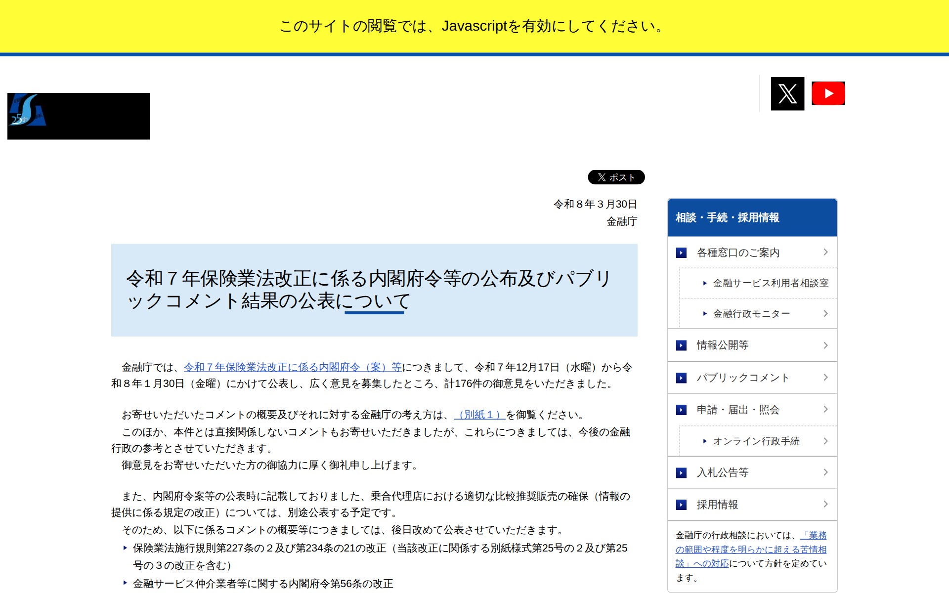 令和7年保険業法改正に係る内閣府令等の公布及びパブリックコメント結果の公表について:金融庁