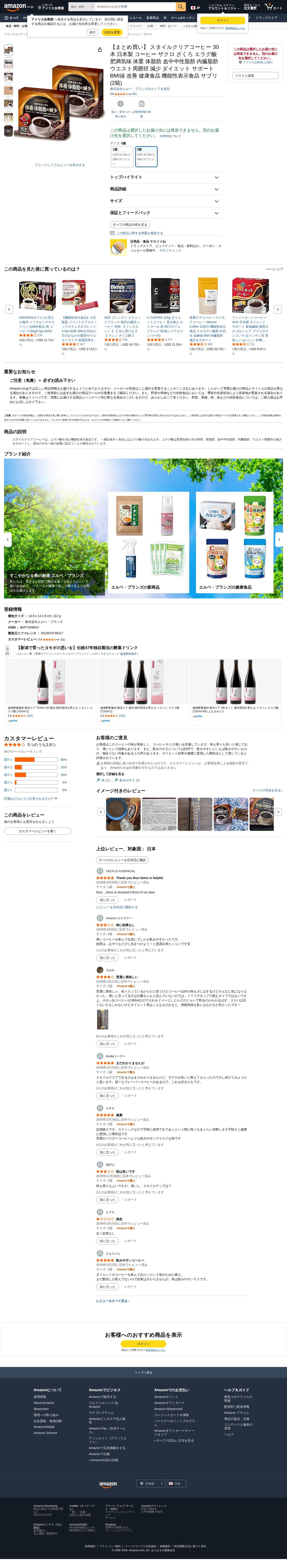 Amazon.co.jp: 【まとめ買い】 スタイルクリアコーヒー 30本 日本製 コーヒー ザクロ ざくろ エラグ酸 肥満気味 体重 体脂肪 血中中性脂肪 内臓脂肪 ウエスト周囲径 減少 ダイエット サポート BMI値 改善 健康食品 機能性表示食品 サプリ (2箱) : ドラッグストア - Saved screenshot