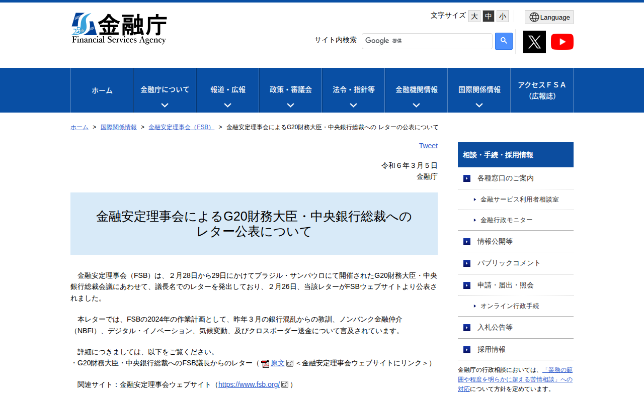 金融安定理事会によるG20財務大臣・中央銀行総裁への レターの公表について:金融庁