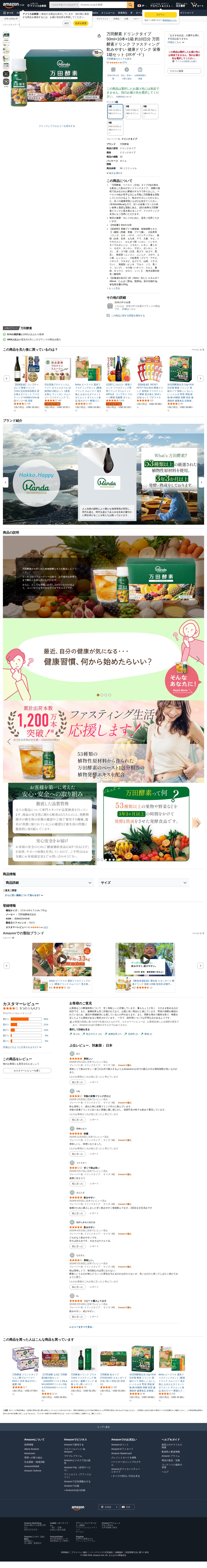 This page presents the Manda Enzyme Drink Type product on Amazon.co.jp, containing 10 bottles of 50ml each. This convenient drink formulation contains the equivalent of one packet of Manda Enzyme paste, made through fermentation. It caters to those who find paste or granule forms difficult. With only 38 calories per bottle, it supports daily health habits and can be used for fasting by replacing one meal. The product has a 4.2-star rating from 371 customer reviews.