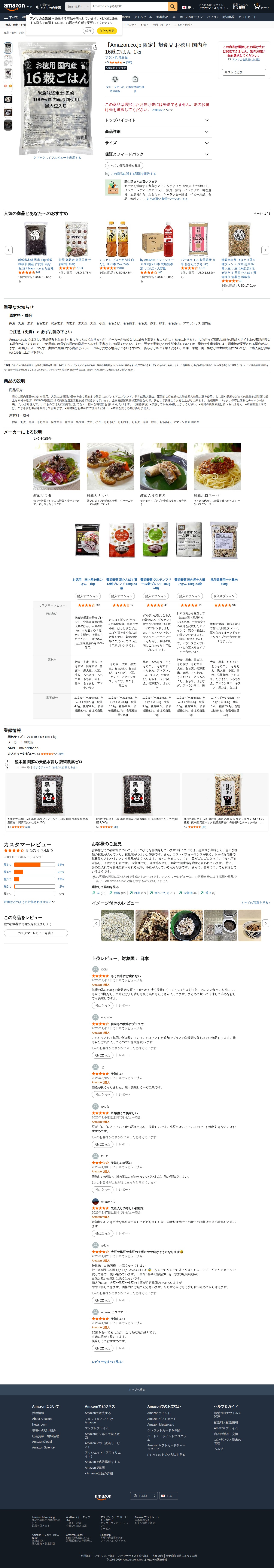 This page features Amazon.co.jp's exclusive product "Asahi Foods Economical 16-Grain Rice 1kg," made from domestic Japanese grains. The blend includes barley, black rice, brown rice, black soybeans, adzuki beans, millet, and other grains. The product has a 4.5-star rating from 380 reviews. A promotional campaign offers 5% off when purchasing 2+ items in the New Life Fair. The page includes product highlights, detailed specifications, and ingredient information.