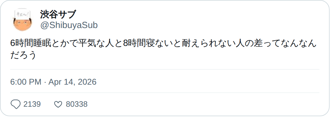 6時間睡眠とかで平気な人と8時間寝ないと耐えられない人の差ってなんなんだろう