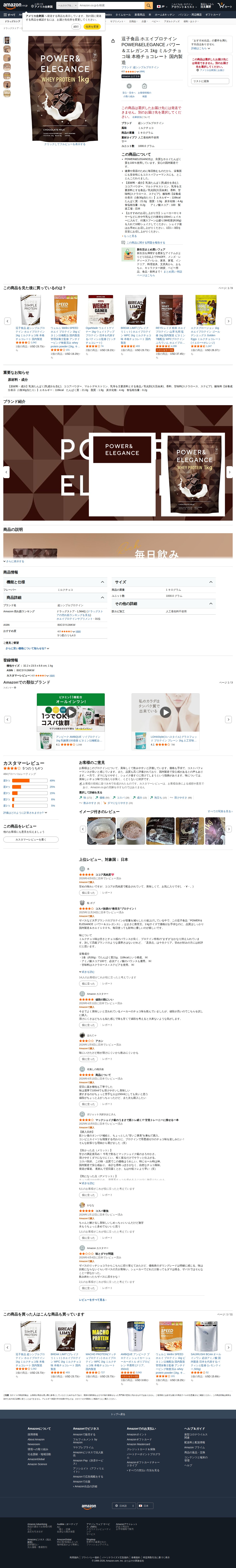 Amazon | 逗子食品 ホエイプロテイン POWER&ELEGANCE パワー&エレガンス 1kg ミルクチョコ味 本格チョコレート 国内製造 | 超シンプルプロテイン | ホエイプロテイン - Saved screenshot