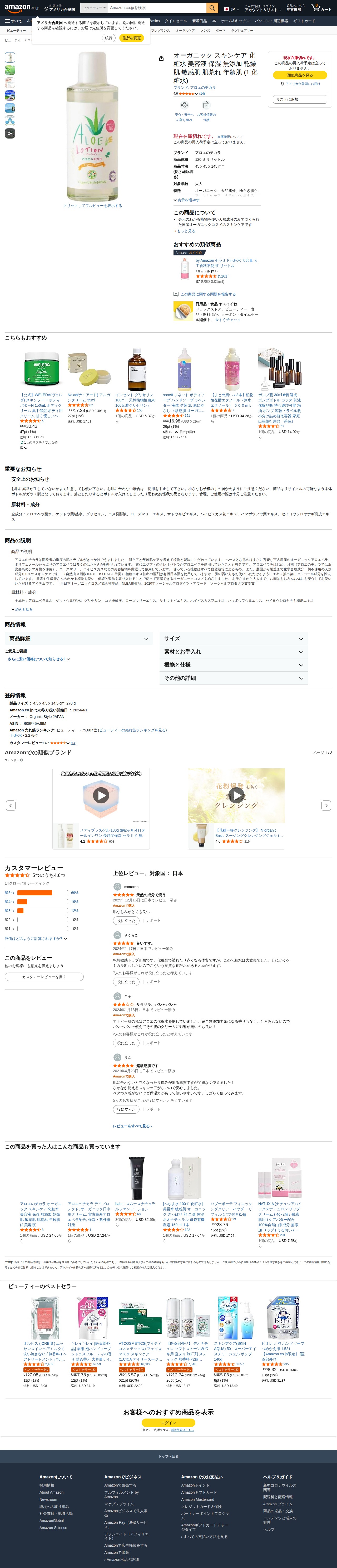 This page presents an organic skincare lotion by the brand "Aloe no Chikara" sold on Amazon. The 120ml product is made entirely from natural ingredients as domestic organic cosmetics. It contains mucopolysaccharides, aloesin, and various vitamins, targeting various skin concerns including dryness, sensitivity, irritation, and aging skin. The product is free from artificial fragrances and cruelty-free certified, with an average rating of 4.6 stars. Currently, the item is out of stock with no planned restock.