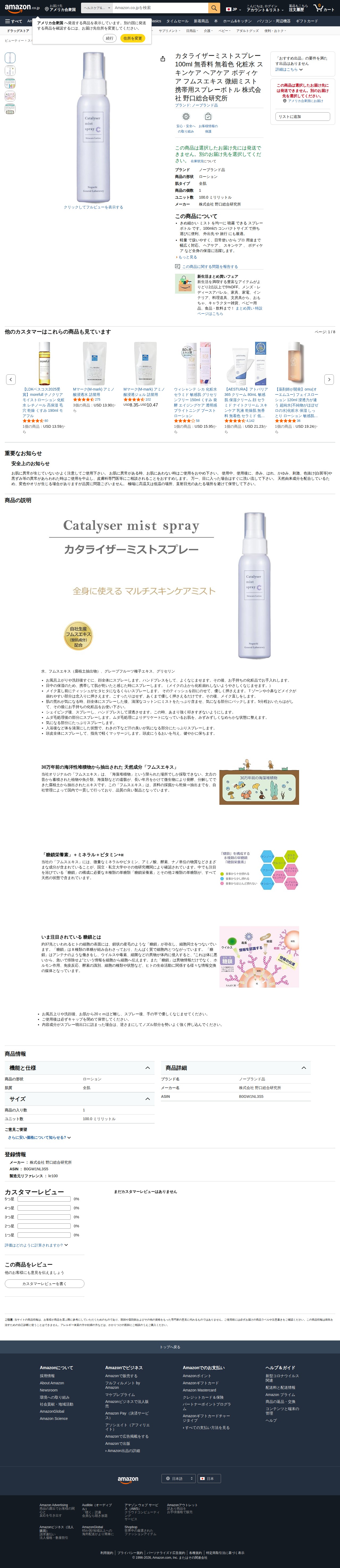 This page presents the Katalyzer Mist Spray 100ml, a fragrance-free, color-free toner sold on Amazon by Noguchi Research Institute Co., Ltd. The portable spray bottle features a fine mist function infused with humus extract, suitable for all skin types. Its compact 100ml size makes it convenient for travel and daily use. Lightweight and easy to handle, it effectively moisturizes skin, hair, and body for both personal and professional applications. However, shipping to the currently selected destination is unavailable.