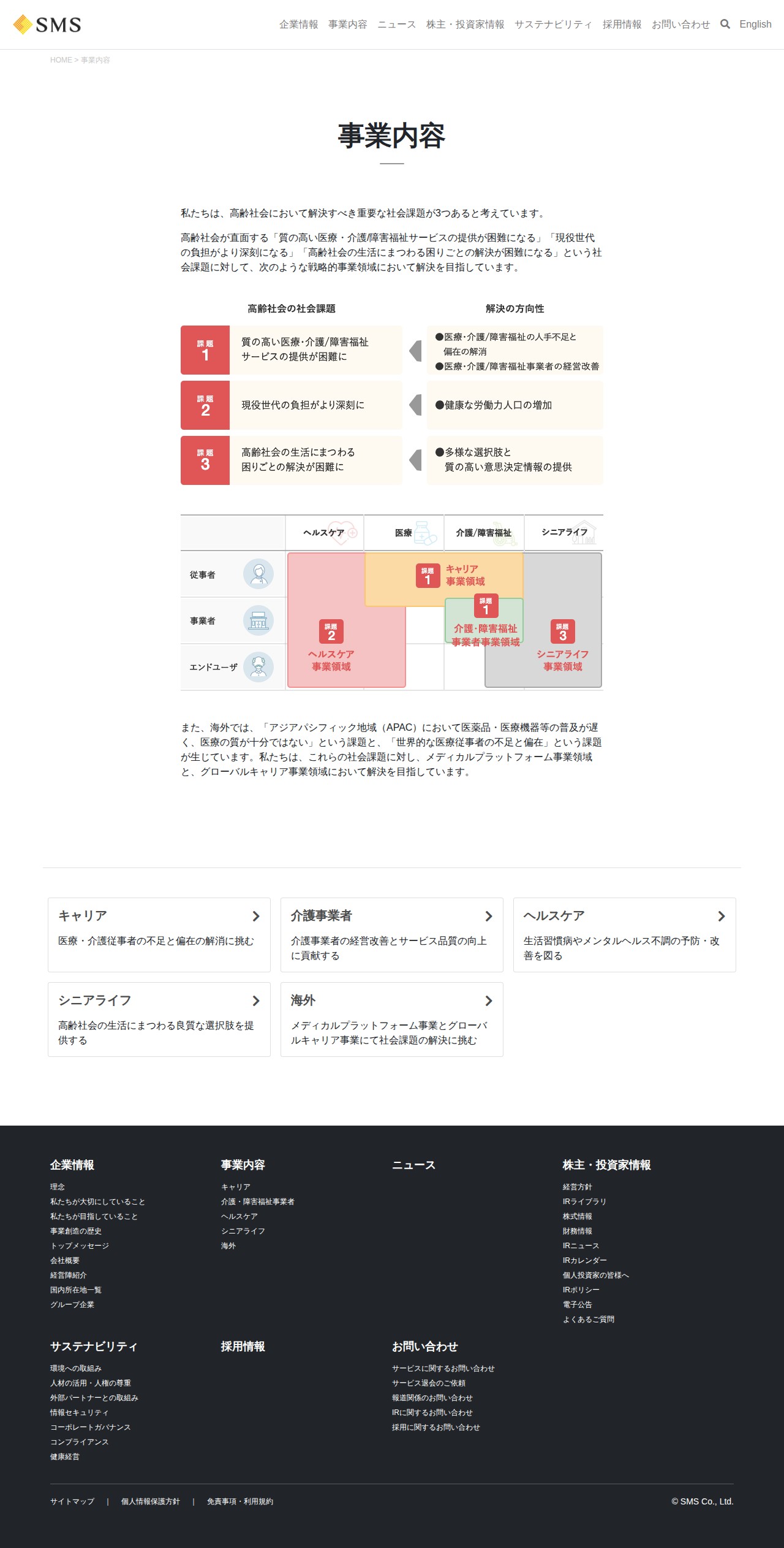 This page outlines the business operations of SMS Co., Ltd. The company addresses three major social challenges in aging societies: difficulty providing quality medical/care services, increasing burden on working-age populations, and unresolved daily-life issues. The company operates in four domestic sectors: Career services for healthcare workers, support for care facilities, healthcare prevention, and senior lifestyle solutions. Internationally, it tackles medication accessibility and healthcare worker shortages in the Asia-Pacific region through medical platform and global career business domains.