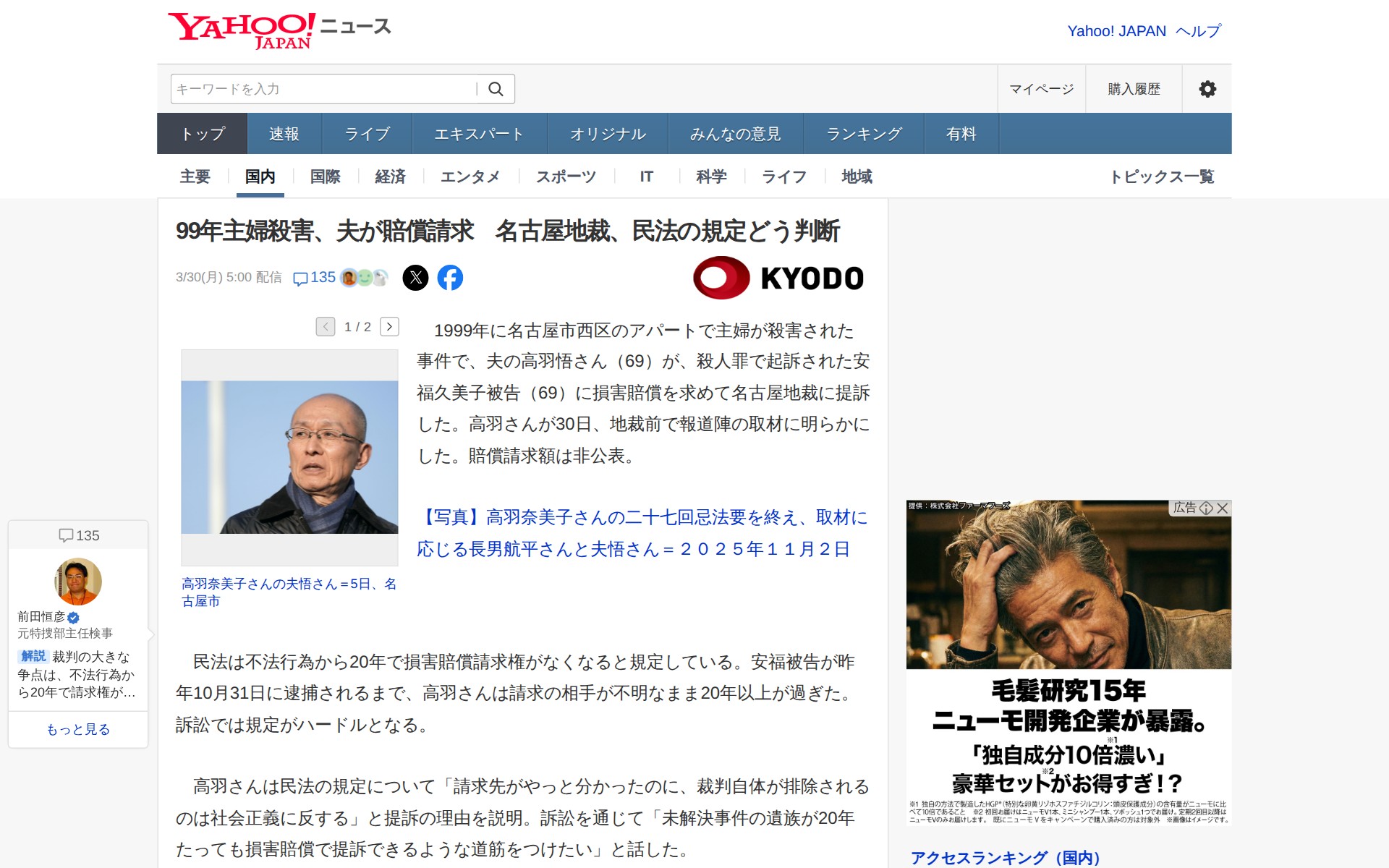 99年主婦殺害、夫が賠償請求 名古屋地裁、民法の規定どう判断(共同通信) - Yahoo!ニュース