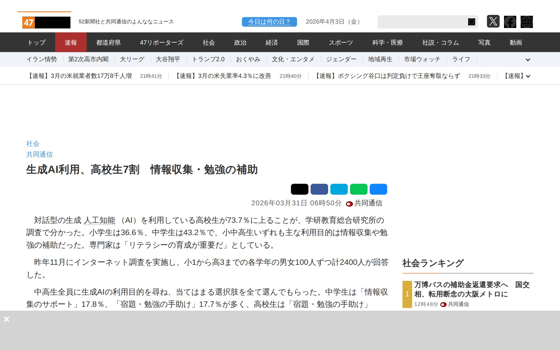 生成AI利用、高校生7割 情報収集・勉強の補助|47NEWS(よんななニュース)