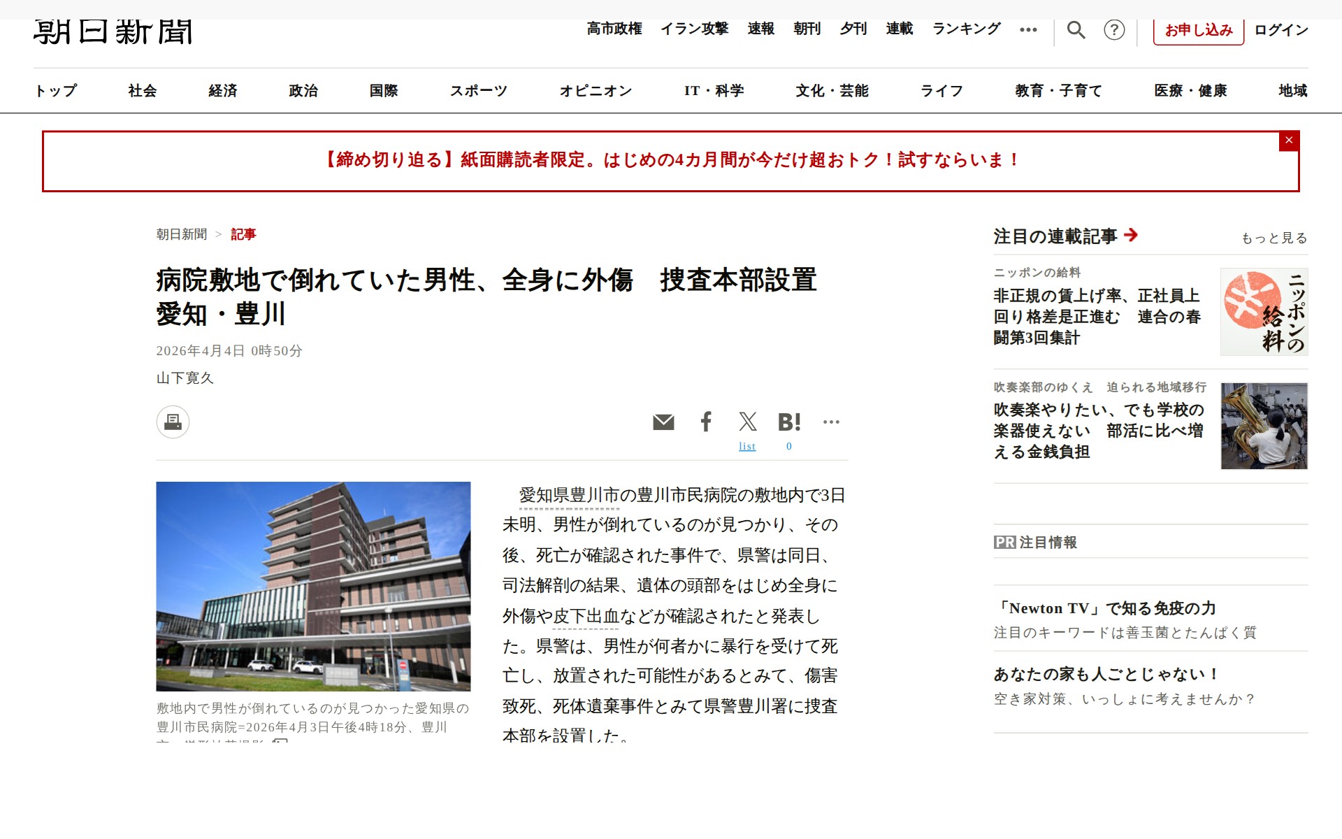 ![病院敷地で倒れていた男性、全身に外傷 捜査本部設置 愛知・豊川 [愛知県]:朝日新聞 - Saved screenshot](https://pub-f6fa8ca7bebe4069bff3224f9a8f5334.r2.dev
