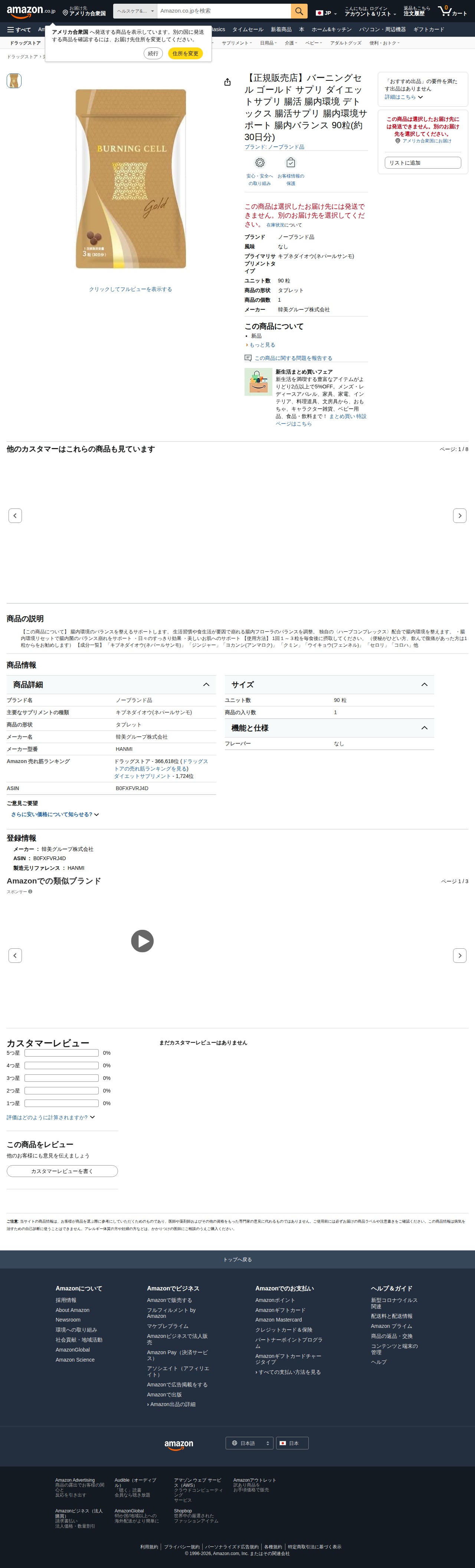 Amazon | 【正規販売店】バーニングセル ゴールド サプリ ダイエットサプリ 腸活 腸内環境 デトックス 腸活サプリ 腸内環境サポート 腸内バランス 90粒(約30日分) | ノーブランド品 | ダイエットサプリメント - Saved screenshot