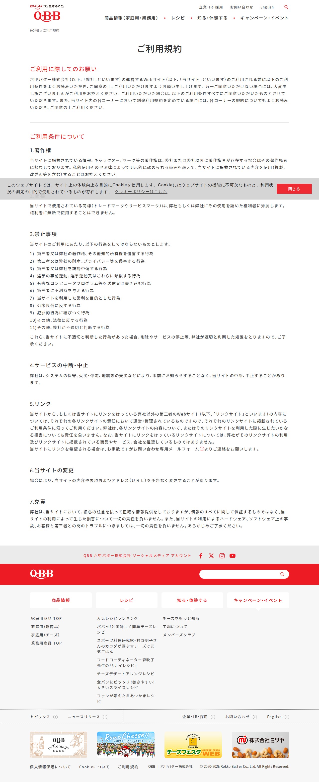 This page presents the terms of service for the website operated by Rokko Butter Co., Ltd. It outlines rules regarding cookie usage, copyright and trademark protection, and prohibited activities. Prohibited actions include intellectual property infringement, privacy violations, defamation, sending harmful programs, commercial use, and criminal activities. The page also covers service interruptions, linking policies, and disclaimers. Violations may result in content deletion or service suspension at the company's discretion.