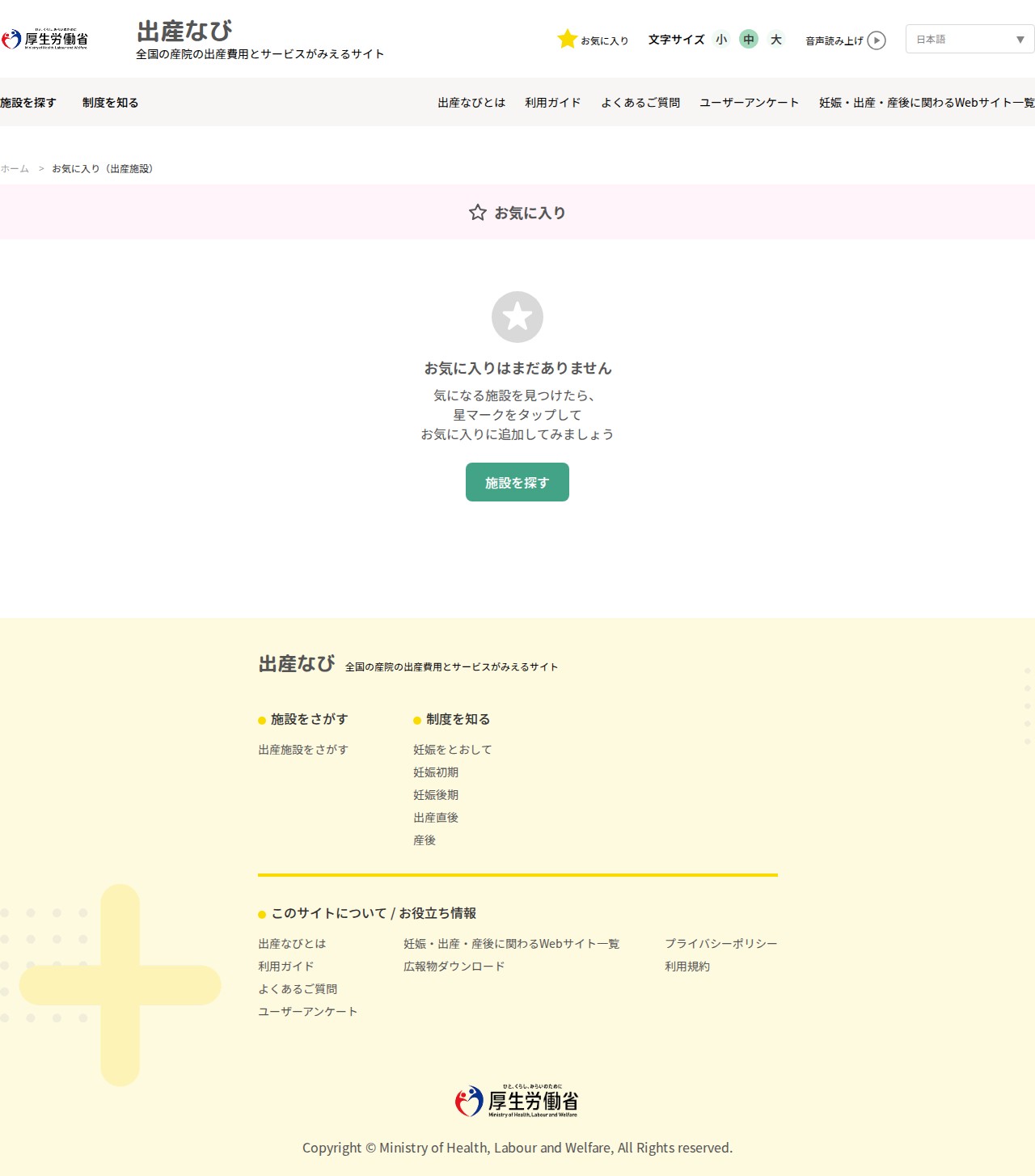 This page is the favorites list section of "Birth Navi," operated by Japan's Ministry of Health, Labour and Welfare. It's a website displaying childbirth costs and services at obstetric facilities nationwide. Users can save facilities of interest by tapping star marks and access them later. Currently, no favorites are registered. The site provides information across pregnancy stages from initial pregnancy through postpartum period, helping users search for and compare maternity services and associated information.