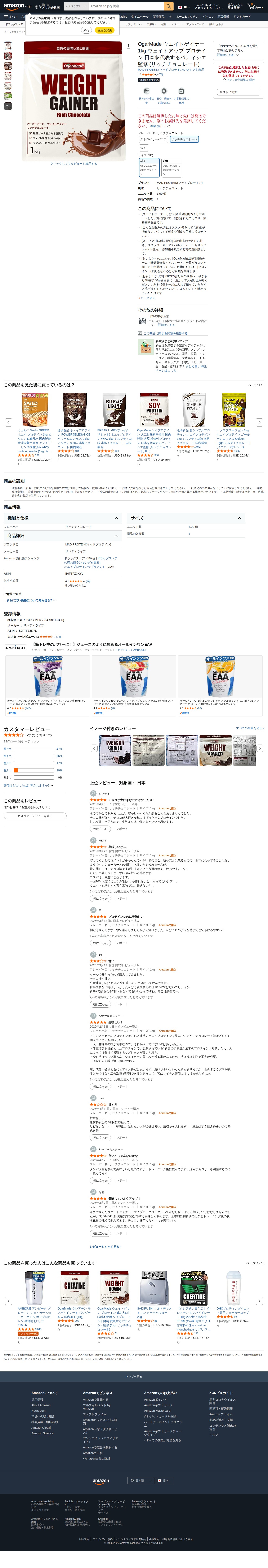 Amazon | OgarMade ウエイトゲイナー 1kg ウェイトアップ プロテイン 日本を代表するパティシエ監修 (リッチチョコレート) | MAD PROTEIN(マッドプロテイン) | ホエイプロテイン - Saved screenshot