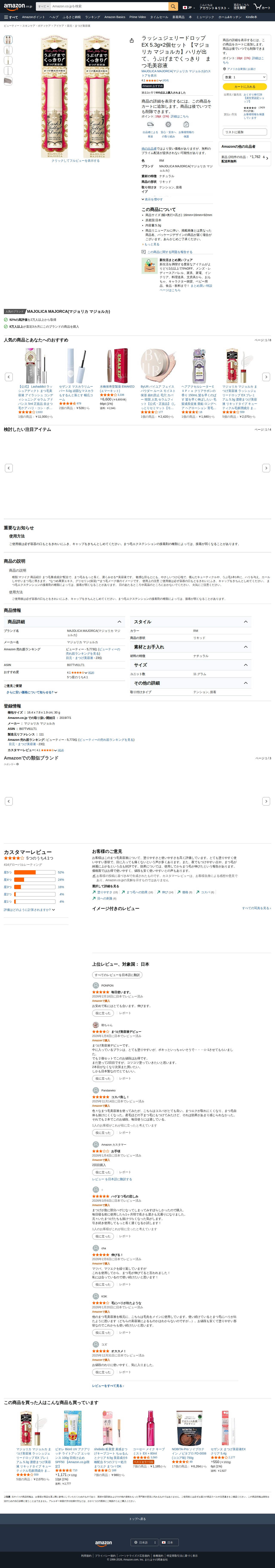 This page introduces Majolica Majorca's Lash Jelly Drop EX, a set of two eyelash serums (5.3g each) priced at ¥1,762. The product is designed to enhance lash appearance and make fine hairs more defined. It has received 4.1 out of 5 stars from 414 reviews and sold over 600 units in the past month. The liquid-type serum is manufactured in Japan and available on Amazon with free Prime shipping options.