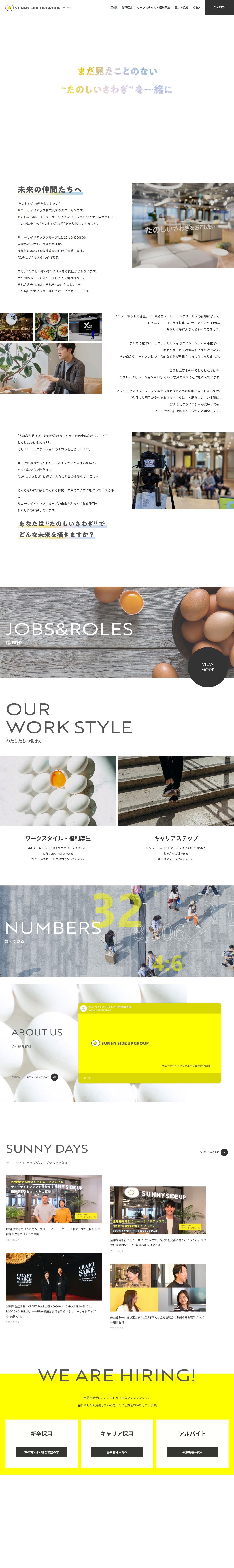 This page presents the recruitment information for Sunny Side Up Group, a professional communication company founded on the motto "Create enjoyable excitement." The company employs diverse talent spanning ages 20-60 with various nationalities and backgrounds. While respecting individual expressions of happiness, the company emphasizes social responsibility and ethical practices. As communication methods evolve with technology and societal values like sustainability and diversity gain importance, the company remains committed to PR's power to inspire human hearts and drive social change. The company actively recruits new graduates, career professionals, and part-time workers.