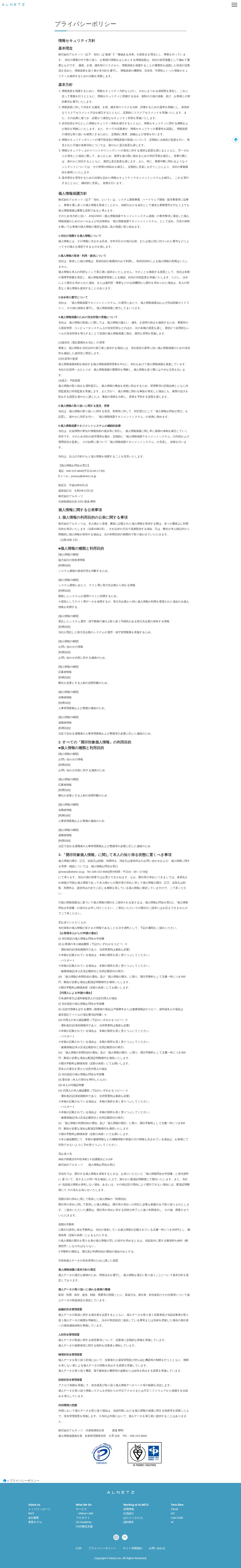 This page outlines Al-nets Corporation's Privacy Policy and Information Security Policy. The company is committed to creating valuable futures at "ultra-high speed" and recognizes the critical importance of protecting customer information and information assets as its foundation. The Information Security Policy establishes risk assessment, countermeasures, organizational structure, regular audits, and incident response as core principles. The Personal Information Protection Policy implements a system compliant with JISQ15001, ensuring personal information is used only for specified purposes, not disclosed to third parties without consent, and protected through appropriate security measures while complying with relevant laws.