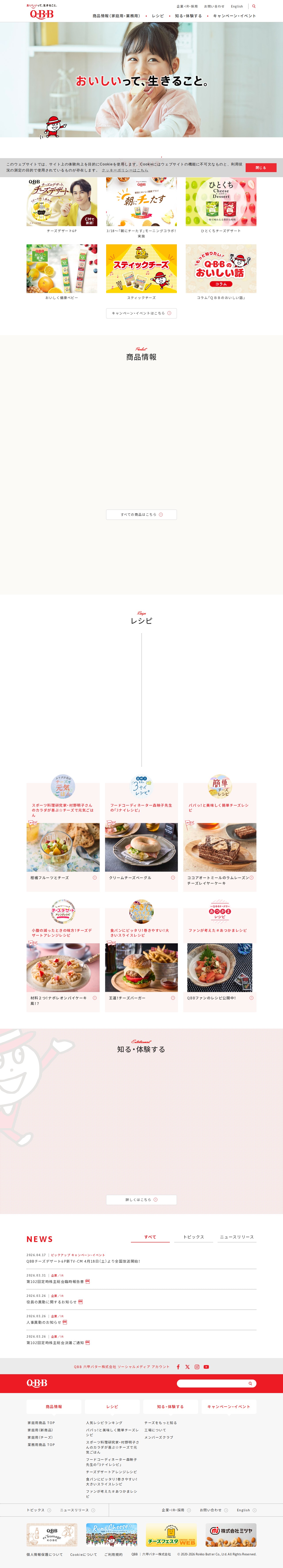 This page is the official website of Rokko Butter Co., Ltd.'s QBB brand, with the concept "Deliciousness is life." It features diverse cheese products including baby cheese, cheese desserts, and sliced cheese for both household and commercial use. The site offers product information, recipes, and experiences such as factory tours. It provides numerous cheese recipes including seasonal recipes and arrangements by renowned culinary experts. Regular updates on new products, campaigns, events, and corporate news are also featured. Social media accounts are available on multiple platforms.