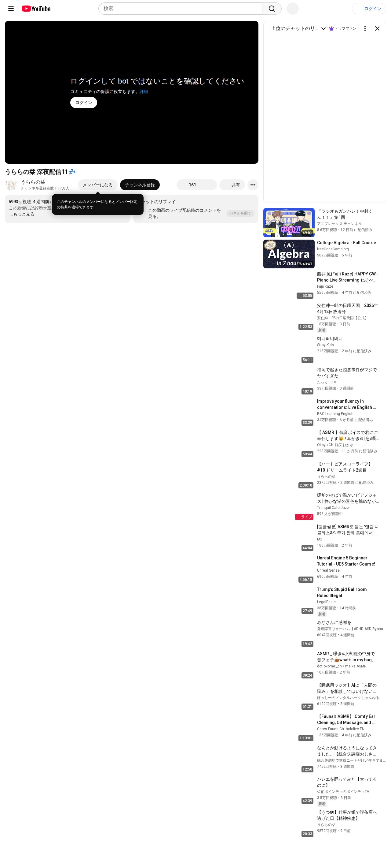 This page displays a late-night livestream video titled "うららの栞 深夜配信11💤" from the YouTube channel "うららの栞" with 11,700 subscribers. The video was broadcast four weeks ago and has received 5,993 views. No description has been added to the video. The page includes a chat replay feature allowing viewers to see comments from the live broadcast. Related videos from various creators are displayed below the main video content.