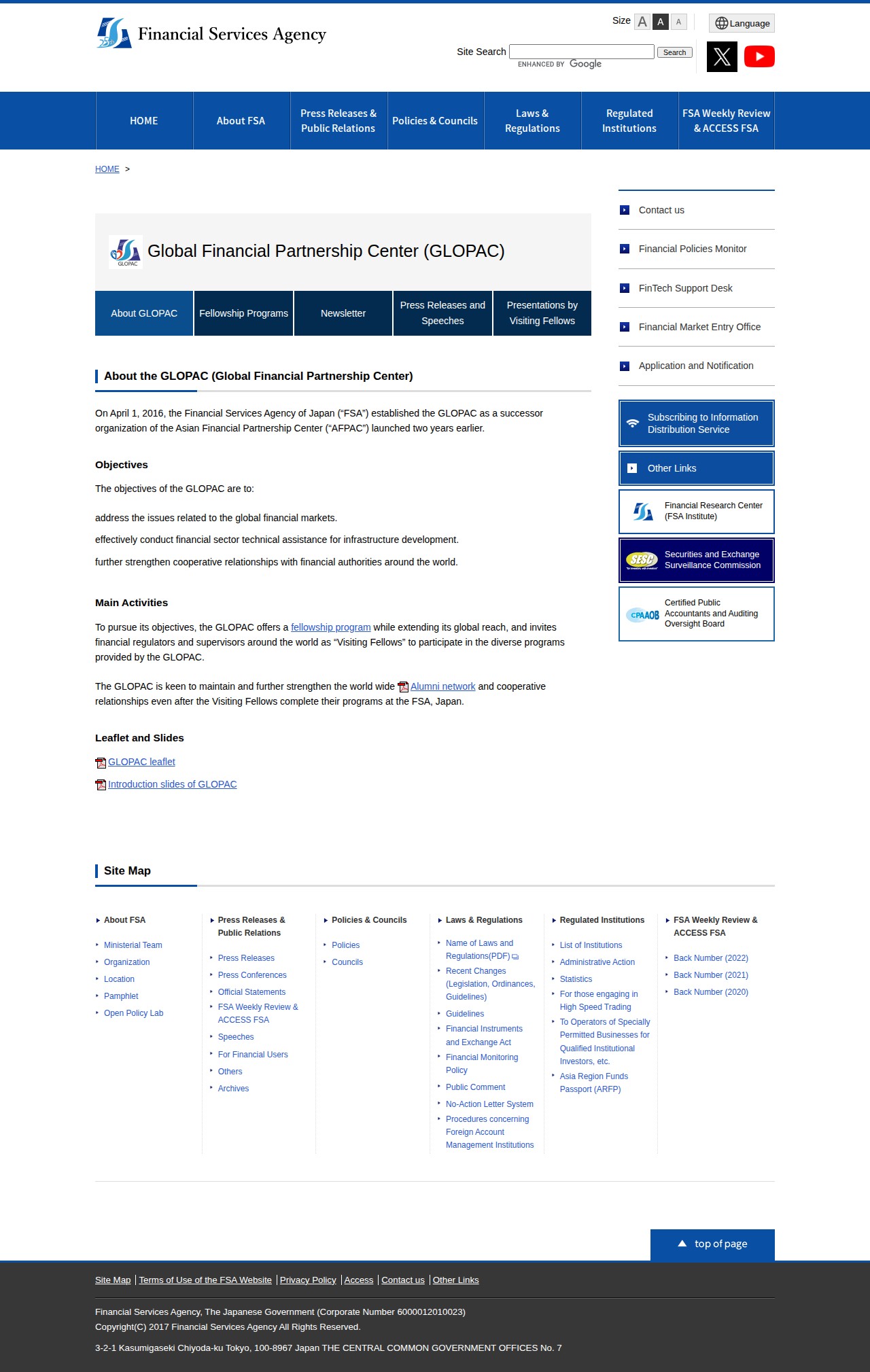 This page describes the Global Financial Partnership Center (GLOPAC), established by Japan's Financial Services Agency on April 1, 2016, as a successor to the Asian Financial Partnership Center. GLOPAC aims to address global financial market issues, conduct financial sector technical assistance for infrastructure development, and strengthen cooperative relationships with financial authorities worldwide. The organization operates through fellowship programs and invites financial regulators and supervisors globally as "Visiting Fellows." GLOPAC maintains and strengthens its worldwide alumni network and cooperative relationships beyond program completion, fostering international collaboration in financial regulation and supervision.