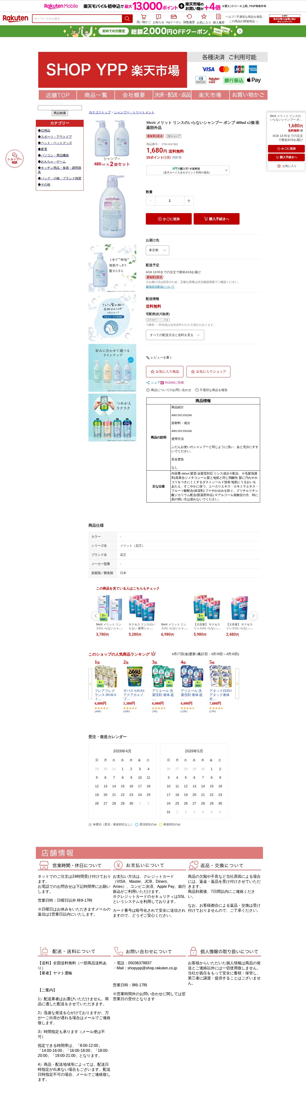 This page presents Merit Rinse-in-One Shampoo Pump 480ml×2 bottles sold on Rakuten Market. Priced at 1,680 yen with free shipping, this quasi-drug product suits all hair types. It features rinse ingredients, weak-acid formula, and dust shield technology. The shampoo contains eucalyptus and chamomile extracts plus fruit acids for moisturizing and glycyrrhizic acid dipotassium to prevent dandruff and itching. Orders placed by April 18, 1 PM are eligible for next-day delivery.