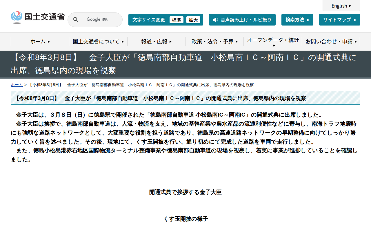 【令和8年3月8日】 金子大臣が「徳島南部自動車道 小松島南IC~阿南IC」の開通式典に出席、徳島県内の現場を視察 - 国土交通省 - Saved screenshot