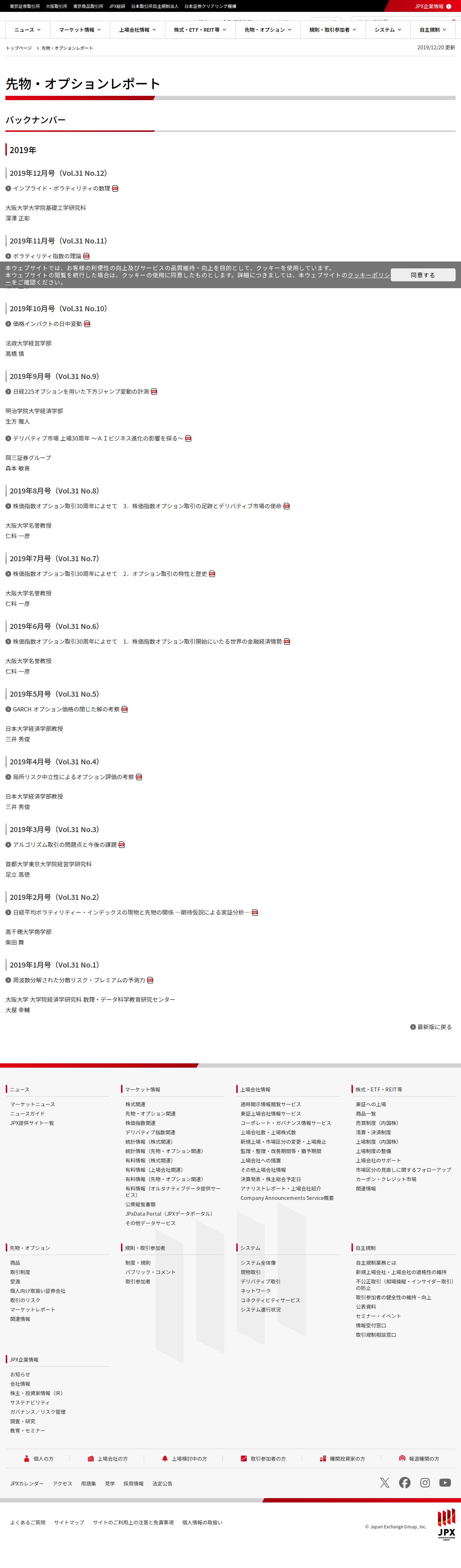 This page is an archive of the Futures and Options Report from the Japan Exchange Group for 2019. It contains twelve monthly reports featuring academic articles on derivative markets written by researchers from universities including Osaka University and Nihon University. Topics include implied volatility, volatility indices, price impact, and special features commemorating the 30th anniversary of stock index options trading.