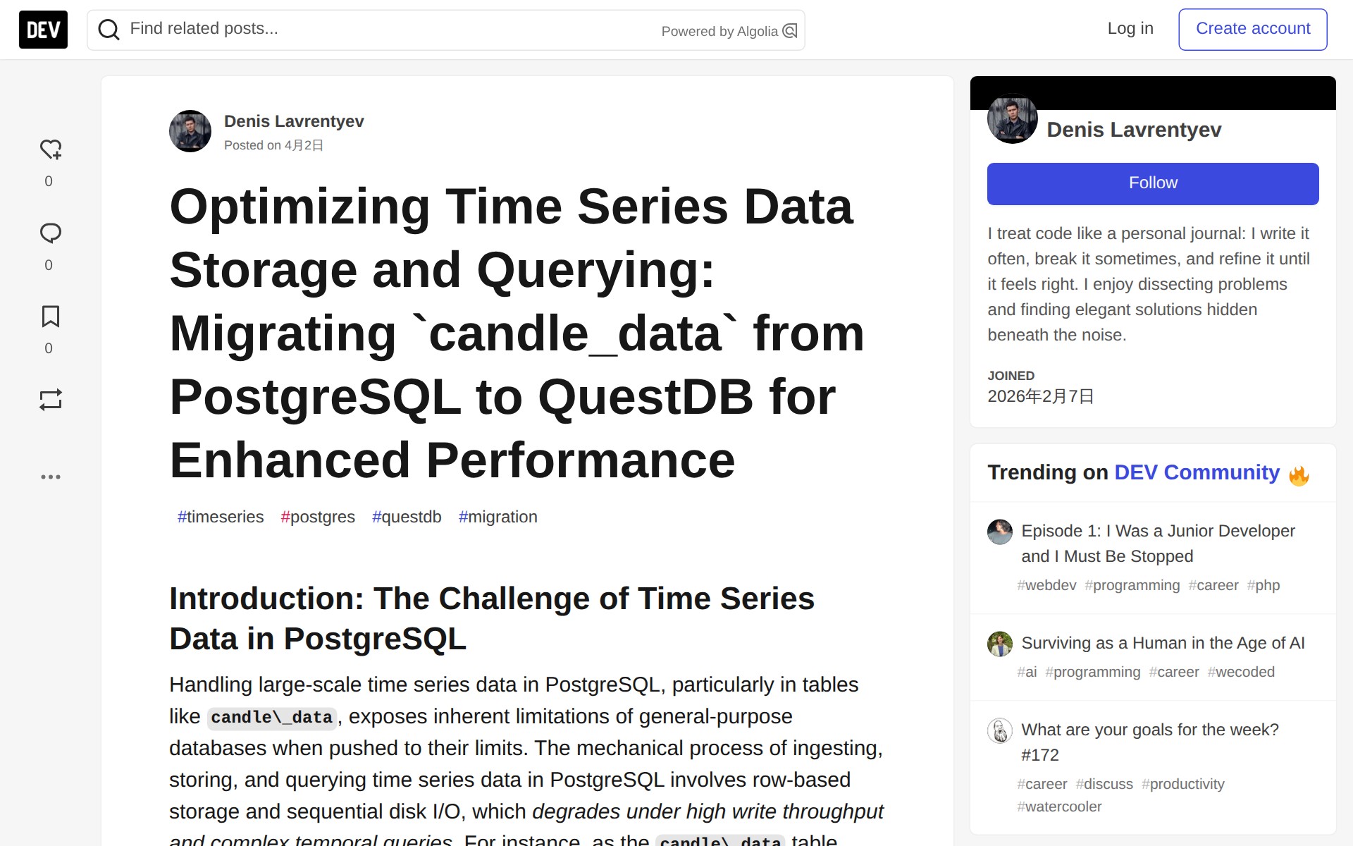 Optimizing Time Series Data Storage and Querying: Migrating `candle_data` from PostgreSQL to QuestDB for Enhanced Performance - DEV Community