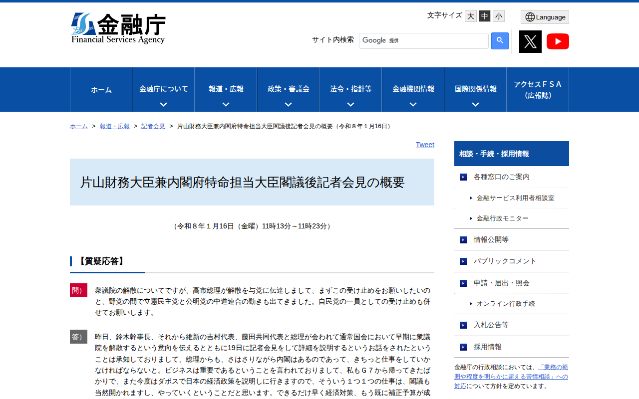 片山財務大臣兼内閣府特命担当大臣閣議後記者会見の概要(令和8年1月16日):金融庁