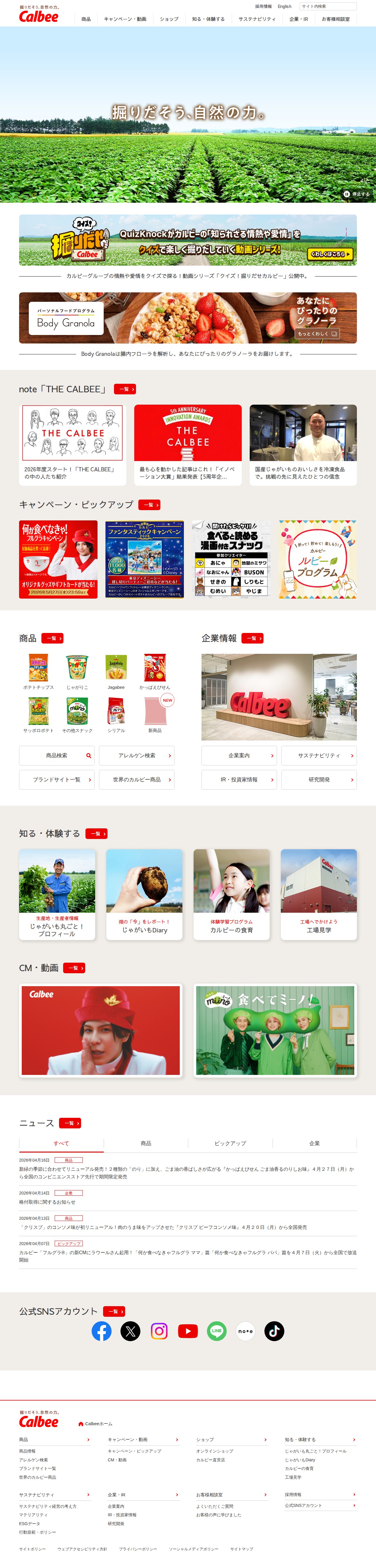 This page is the official website of Calbee Inc., a snack food manufacturer. It provides information on products including potato chips, snacks, and cereals. The site features product details, campaigns, online shopping, factory tours, and corporate information including sustainability and investor relations. Additional content includes potato production information, food education programs, and latest news. The website also offers customer support services and various engagement features like quiz series and personalized product recommendations through Body Granola.