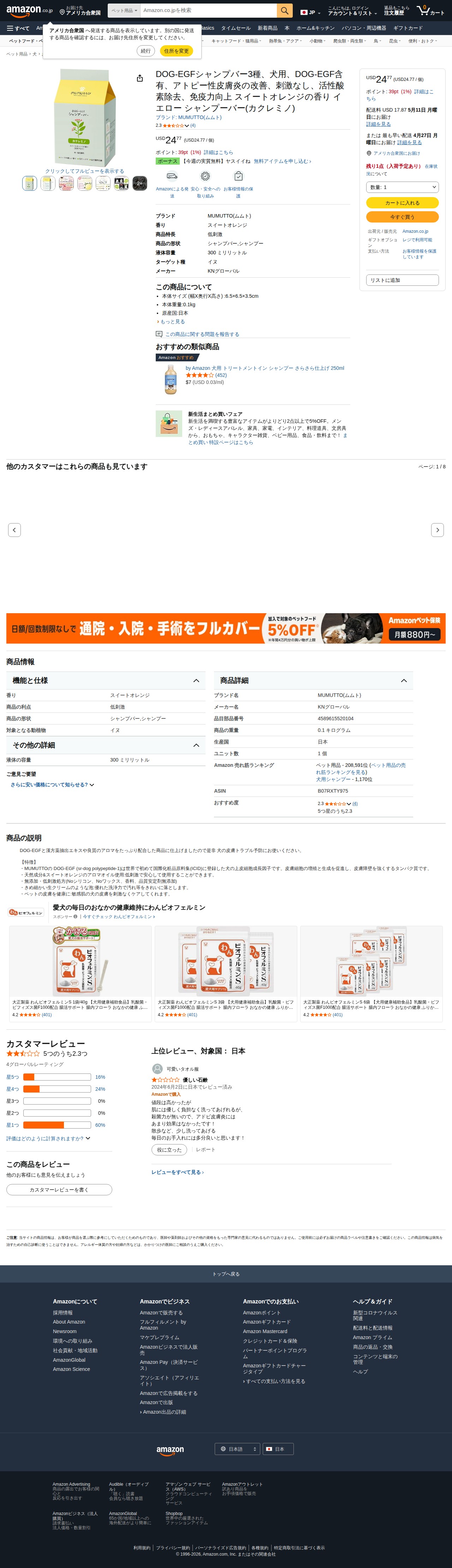 Amazon | MUMUTTO(ムムト) DOG-EGFシャンプバー3種、犬用、DOG-EGF含有、アトピー性皮膚炎の改善、刺激なし、活性酸素除去、免疫力向上 スイートオレンジの香り イエロー シャンプーバー(カクレミノ) | MUMUTTO(ムムト) | シャンプー 通販 - Saved screenshot