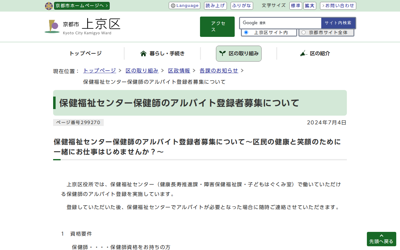 京都市上京区役所:保健福祉センター保健師のアルバイト登録者募集について - Saved screenshot
