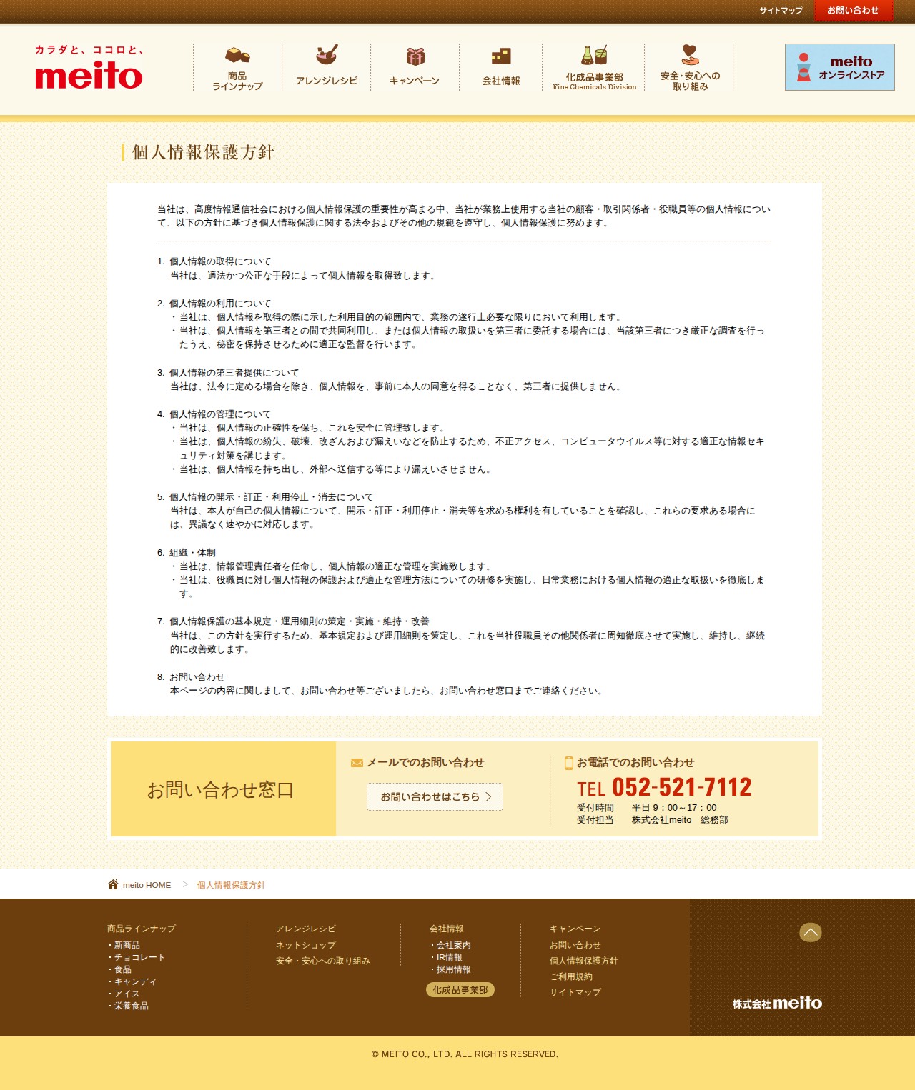 This page presents Meito Corporation's Personal Information Protection Policy. The company acquires personal information through lawful and fair means and uses it only within the scope of stated purposes. Third-party sharing requires prior consent except where legally mandated. The company implements strict security measures against unauthorized access and data breaches. It maintains data accuracy and promptly responds to requests for disclosure, correction, deletion, and usage suspension. An information management officer oversees proper handling, and employee training ensures appropriate data management practices throughout the organization.