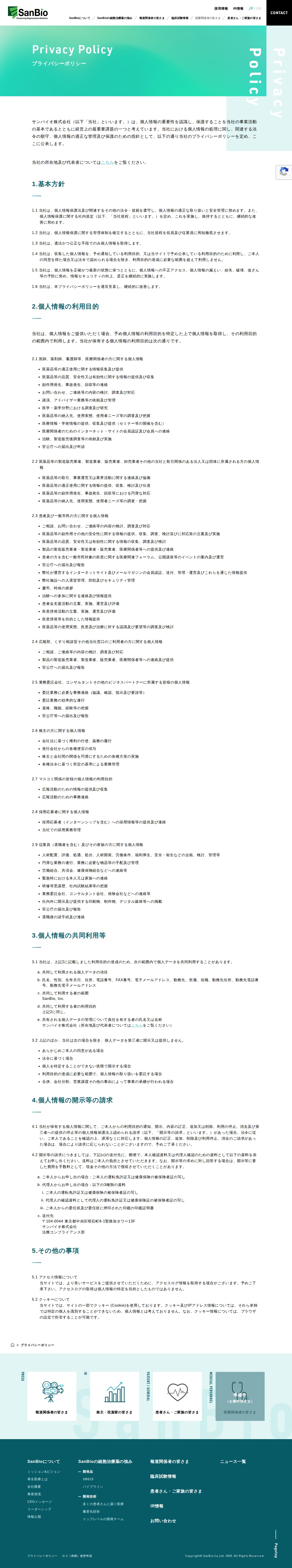 プライバシーポリシー | サンバイオ -再生医療(細胞治療薬)