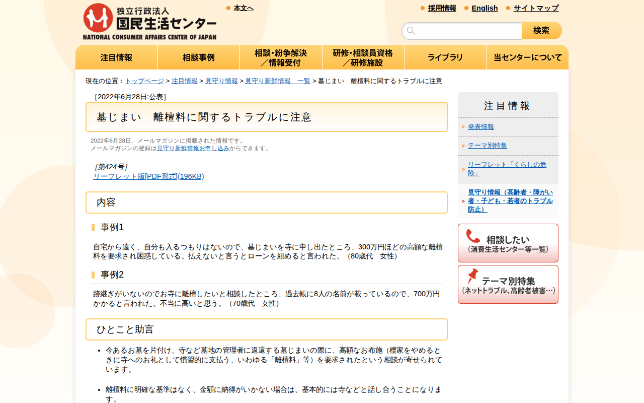 墓じまい 離檀料に関するトラブルに注意(見守り情報)_国民生活センター - Saved screenshot