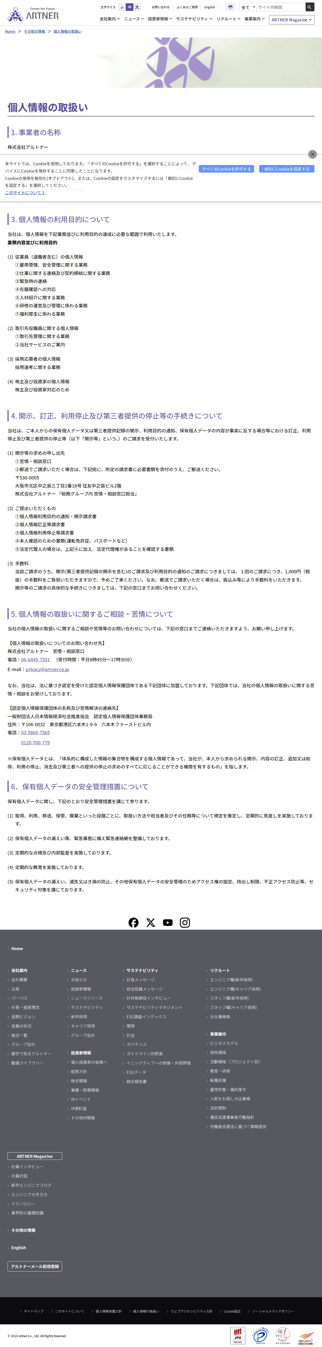 個人情報の取扱い - 株式会社アルトナー - Saved screenshot