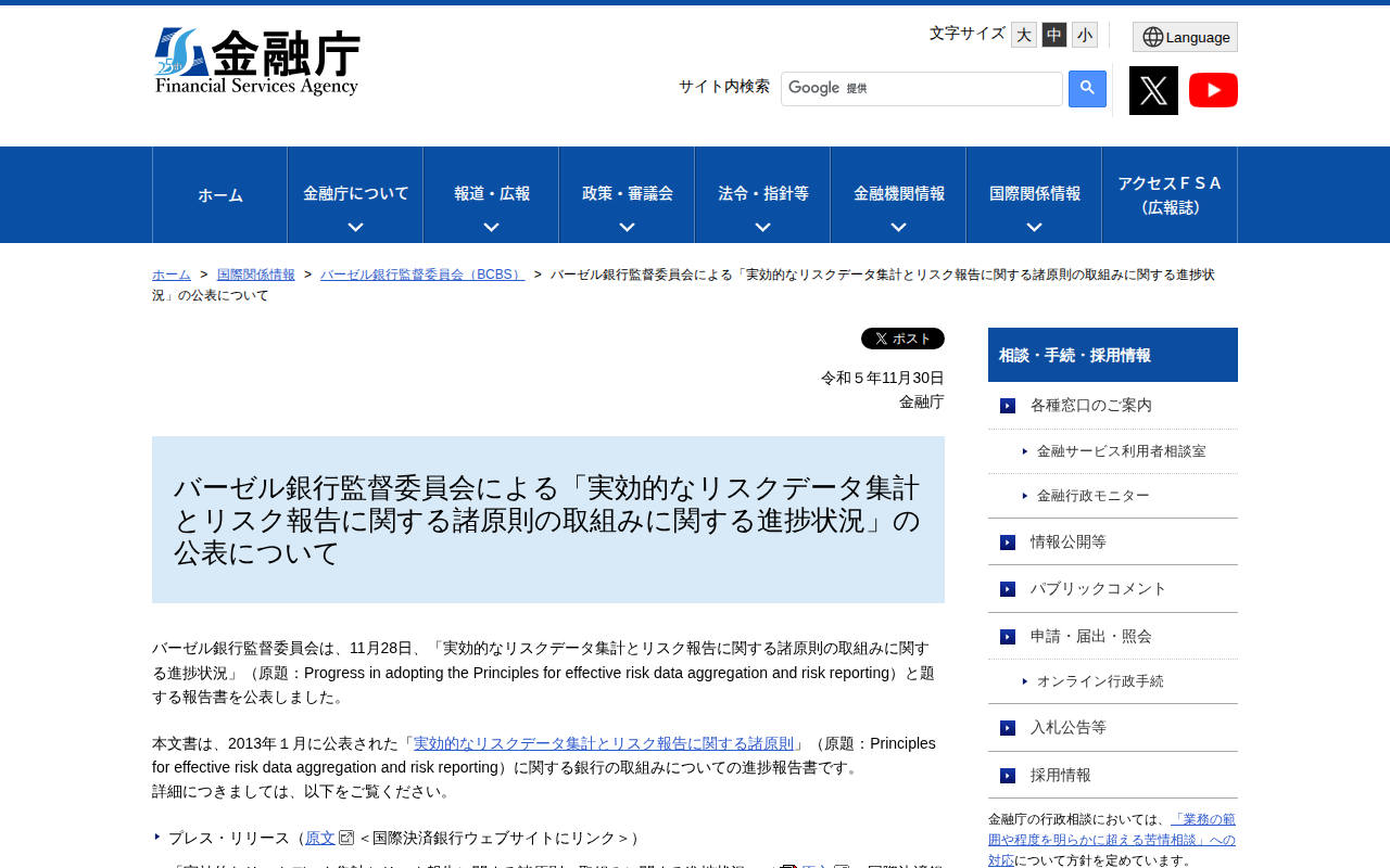 バーゼル銀行監督委員会による「実効的なリスクデータ集計とリスク報告に関する諸原則の取組みに関する進捗状況」の公表について:金融庁