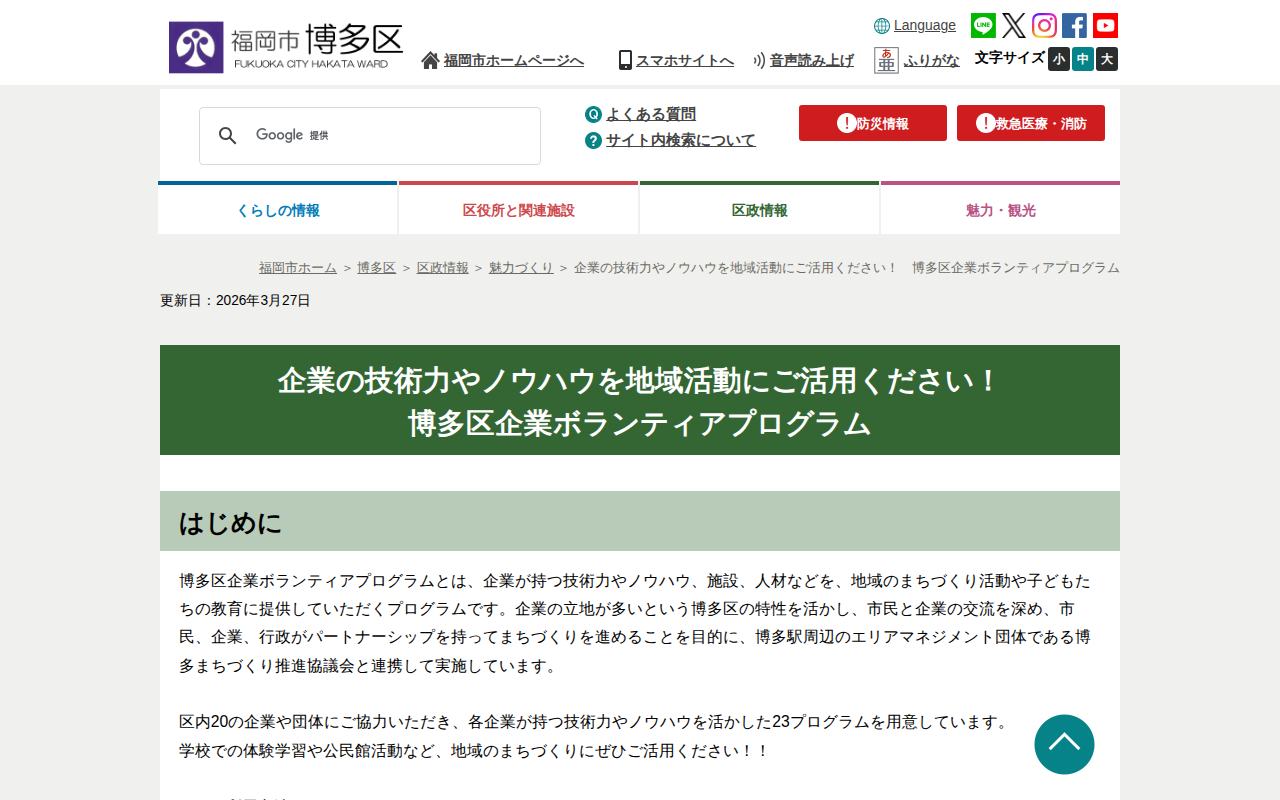福岡市 企業の技術力やノウハウを地域活動にご活用ください! 博多区企業ボランティアプログラム - Saved screenshot