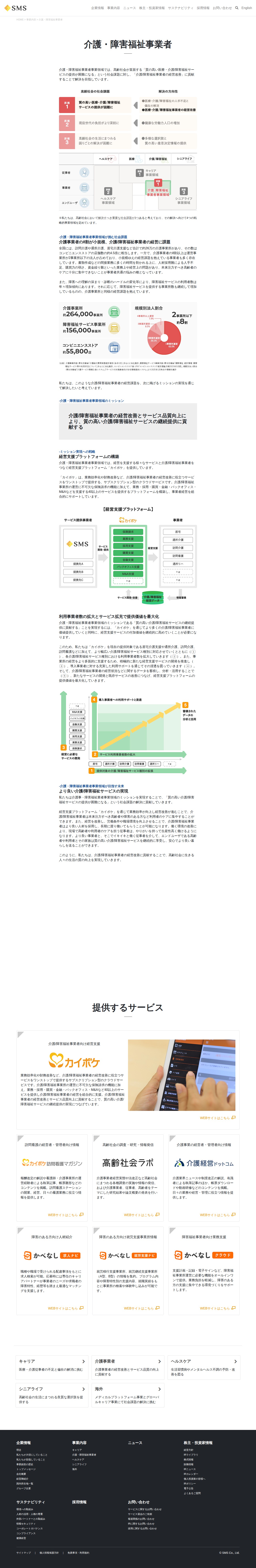 This page describes the care and disability welfare business domain. It addresses the challenge of providing high-quality care and disability welfare services in an aging society by improving the management of care and disability welfare providers. Most of Japan's approximately 260,000 care facilities are small-scale operations facing management challenges like administrative burdens, labor shortages, and cash flow difficulties. The company offers "Kaipoke," a management support platform providing over 40 services including billing, operational efficiency, recruitment, and financial support. By expanding users and enhancing services, Kaipoke enables providers to focus on quality care for elderly and disabled individuals while improving working conditions and employee retention, ultimately delivering better services to users and their families.
